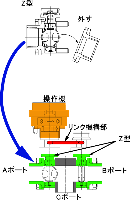 Z型を2台使用し、3方弁を製作します。下図参照