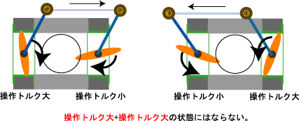 これは、片側の弁体が閉付近(操作トルク大)の時、他方は弁体が開状態(操作トルク小)と真逆の動きになります。